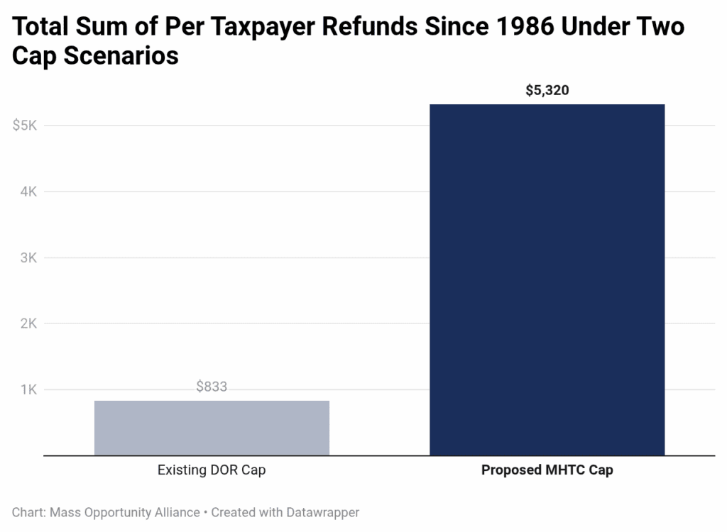The following presents how much each taxpayer (based on 2022 Internal Revenue Service data) would have received since 1987 under the existing cap and under the proposed revised cap – had they paid taxes in Massachusetts since the existing law went into place.