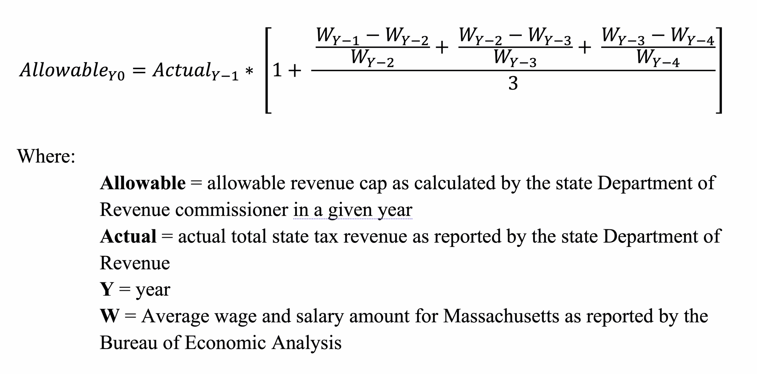 Back in 1986, Massachusetts voters passed a law proposed by the Massachusetts High Tech Council (MHTC) to try to promote fiscal responsibility by calculating how much every year the state was allowed to collect in taxes, starting with 1986 actual revenue, adjusted for wage growth every year. If collections surpassed this calculation, done annually by the state Department of Revenue commissioner, the law said any excess revenues must be refunded to taxpayers. The goal of the law was to prevent the state government from over-collecting and over-spending without taxpayer consent, while keeping revenue and spending tied to economic growth. Currently, Massachusetts is one of 19 states that have a limit on how much the state government can collect in taxes, many of which use economic indicators such as personal income, inflation, or population change to limit growth of the cap. Massachusetts’ current cap calculates growth for a given year by a three-year average growth in average Massachusetts wage and salary levels as measured by the Bureau of Economic Analysis.