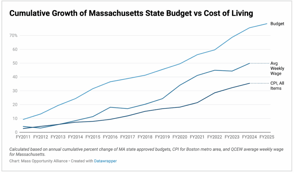 The total budget spending amount for each fiscal year since 2010 has grown 114%, according to state General Appropriations Act documentation. During the same time frame, Massachusetts average wages have grown at half the rate (roughly 62%) and inflation has grown even slower (roughly 42%).